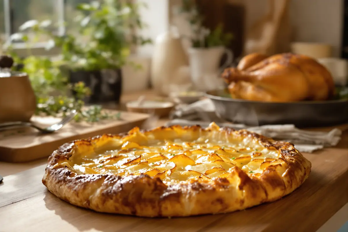 Contrairement à un gratin dauphinois chargé en crème, cette galette de pommes de terre reste légère et facile à couper. Vous pouvez la poser au milieu de la table comme une tarte salée. C’est convivial, chaleureux et étonnamment simple.